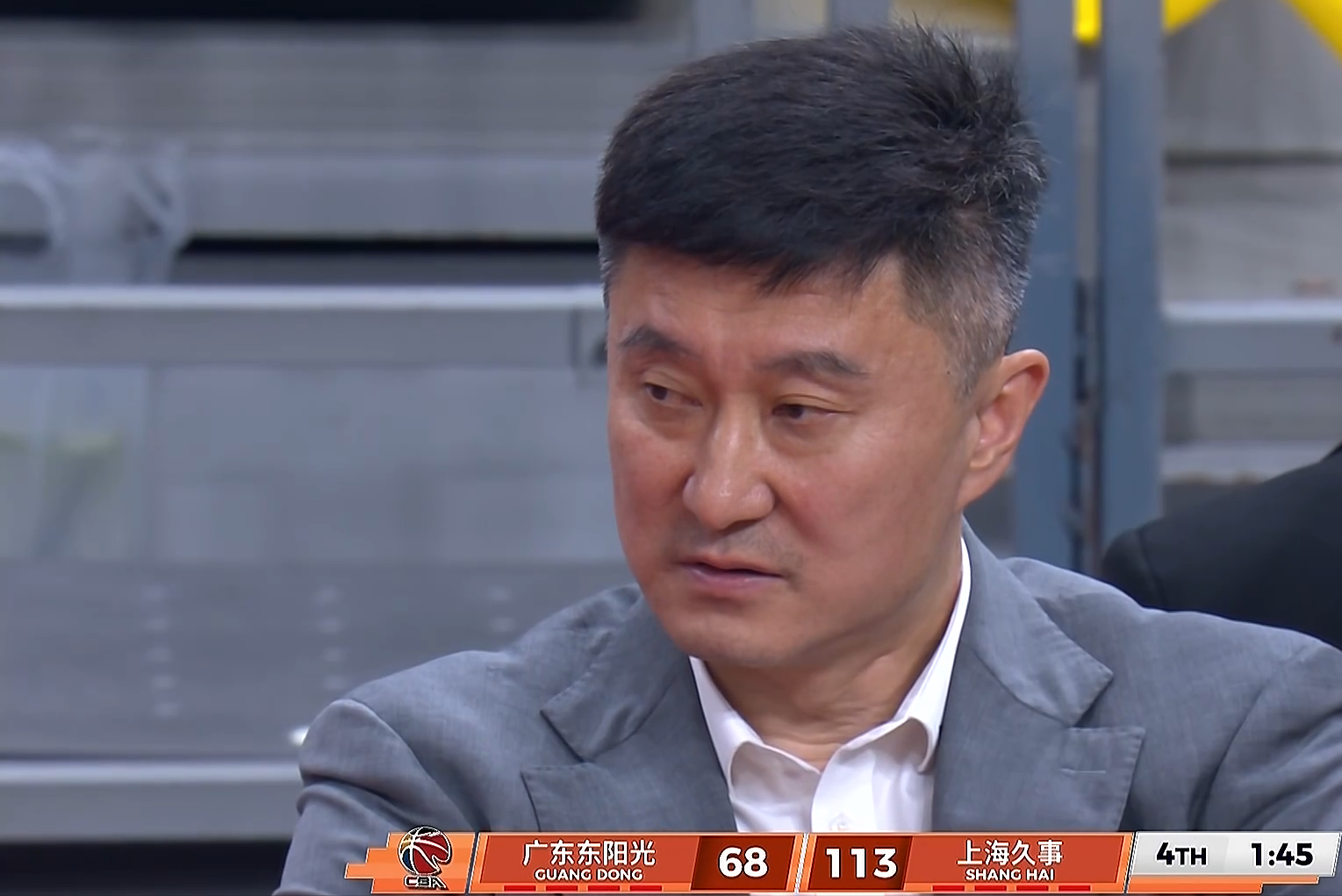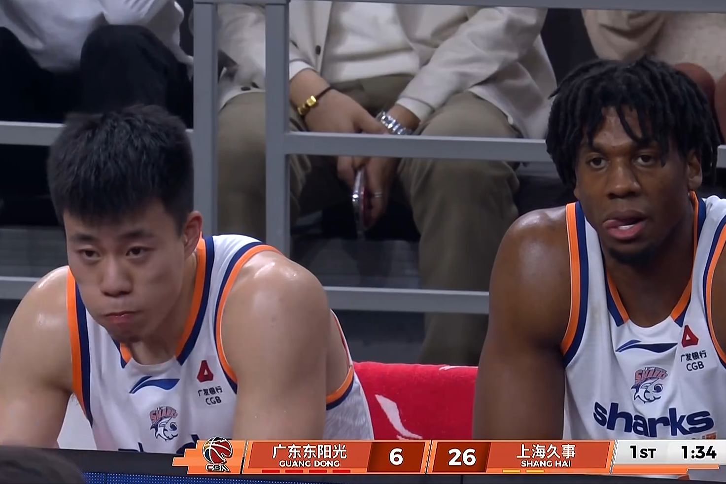 上半场广东队34比60落后。张镇麟13分,古德温13分6助攻,怀特塞德6分14篮板,洛夫顿14分;广东队萨姆纳16分,全队三分20中1,其中徐杰胡明轩两人都是6中0。