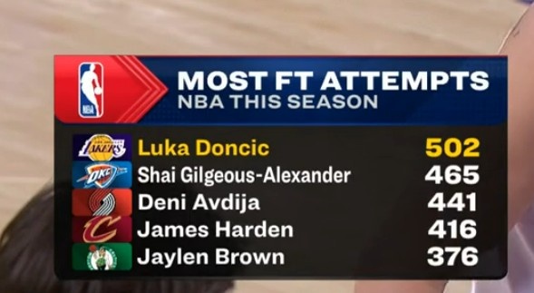 东契奇本赛季罚球超500个联盟首人 亚历山大465个排第二&哈登第四