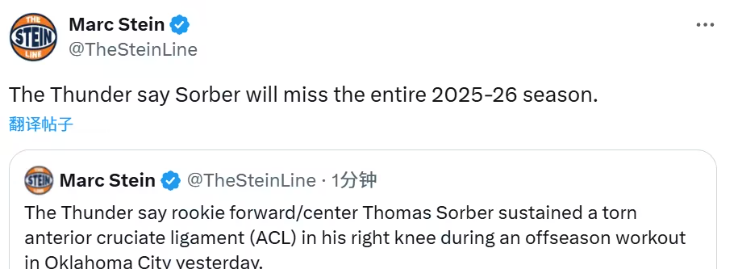 不过,就在今日,一则重磅消息再次搅乱了西部格局。据美媒ESPN名记Shams的最新报道,雷霆队又官宣了一个令人心痛的消息——球队今年的15号新星托马斯-索伯在昨日的休赛期训练中右膝前十字韧带撕裂,意外遭遇赛季报销,将缺席整个2025-26赛季,给志在卫冕的雷霆队蒙上了一层未知的阴影。